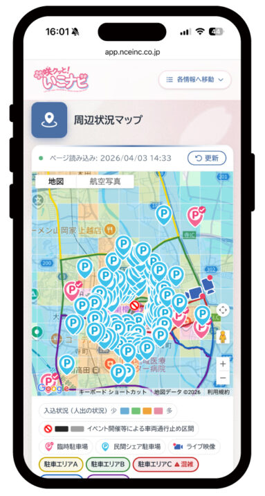 周辺状況マップでは、臨時駐車場(一部有料)の位置や混み具合、予約可能な民間シェア駐車場(有料)の位置も併せて確認できます。さらに、会場内の人出の状況も色によって表示しています。