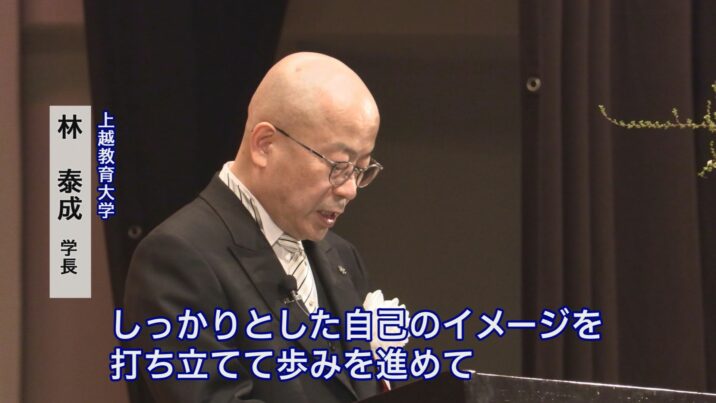 式典でははじめに林泰成学長が、「教員になることだけが最終目的では少し寂しい。教員になってどんな教師を目指すのか考えてほしい。しっかりと自己のイメージを打ち立てつつ歩みを進めて」と教員を目指す心構えを話しました。