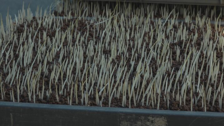 種もみをまいた苗箱は、およそ30度に保たれた場所に3日間置いて、芽が出たらハウスに並べて育てます。