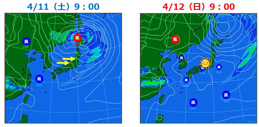 左は11日(土)朝9時の予想天気図