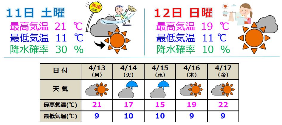 ・最高気温は日ごとに大きく変わって、暖かい日と肌寒い日が交互に現れる予想