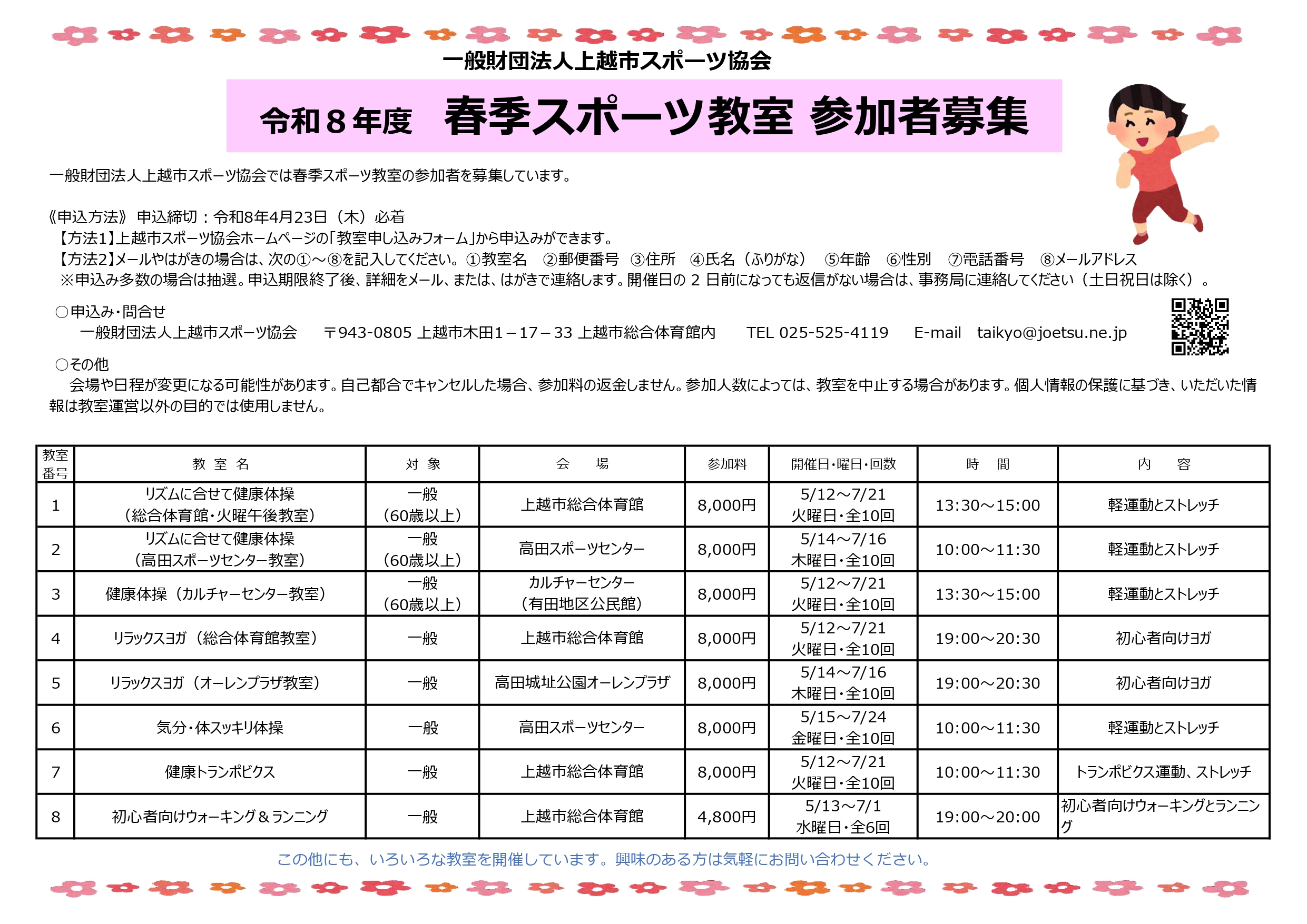 募集しているのは8つの教室です。申し込みは上越市スポーツ協会ホームページの「教室申し込みフォーム」から行ってください。メールやはがきの場合は①教室名、②郵便番号、③住所、④氏名、⑤年齢、⑥性別、⑦電話番号、⑧メールアドレスを記入してください。申し込み締切りは4月23日(木)です。