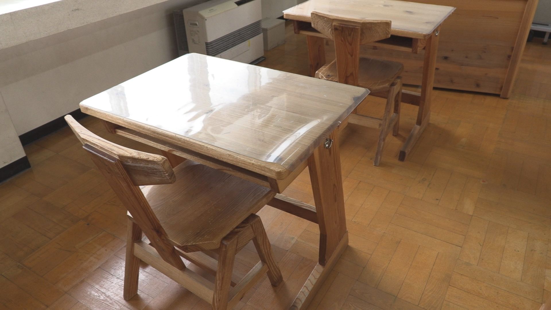 机やいすは、閉校した旧安塚中学校で使われていた木製のものを、テーブルなどは上越教育大学附属中学校で使用されていたものを再利用しています。