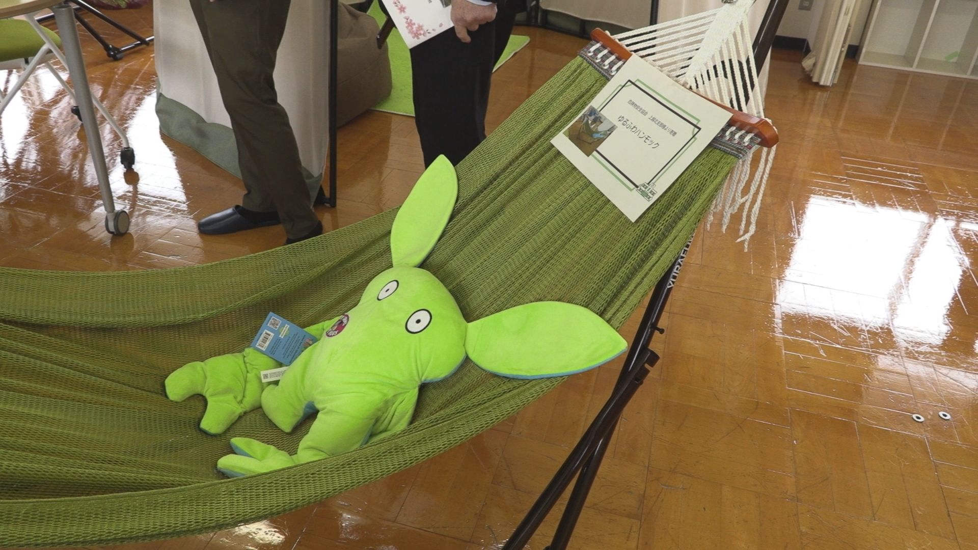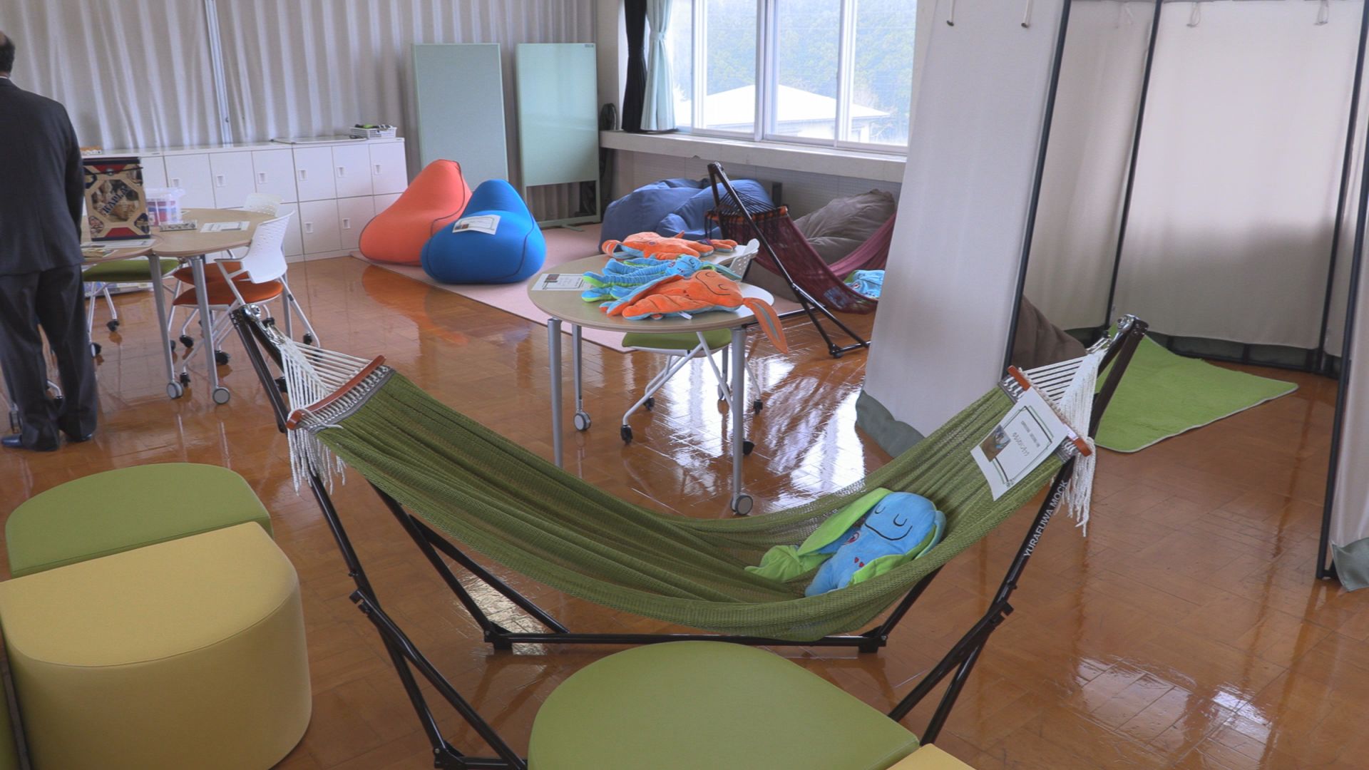 生徒が登校後や下校前に使用する「つどいスペース」には、リラックスできるようクッションやハンモック、ぬいぐるみが置かれています。