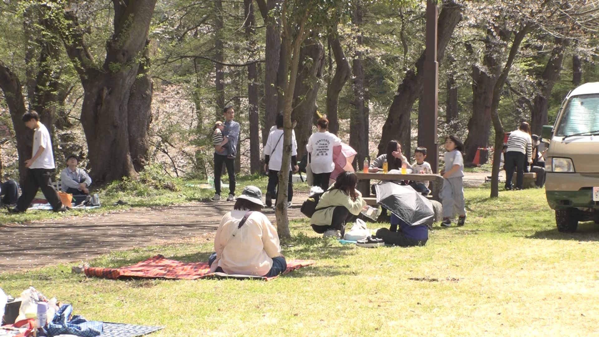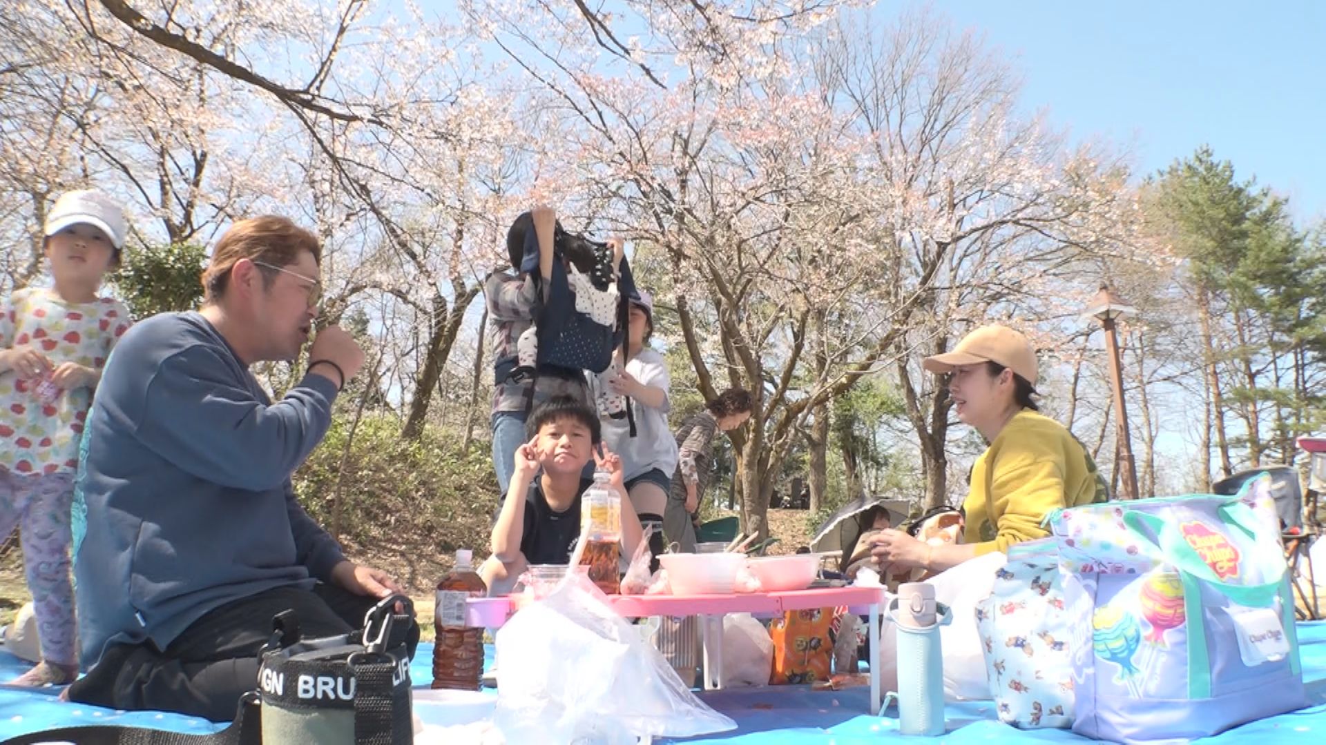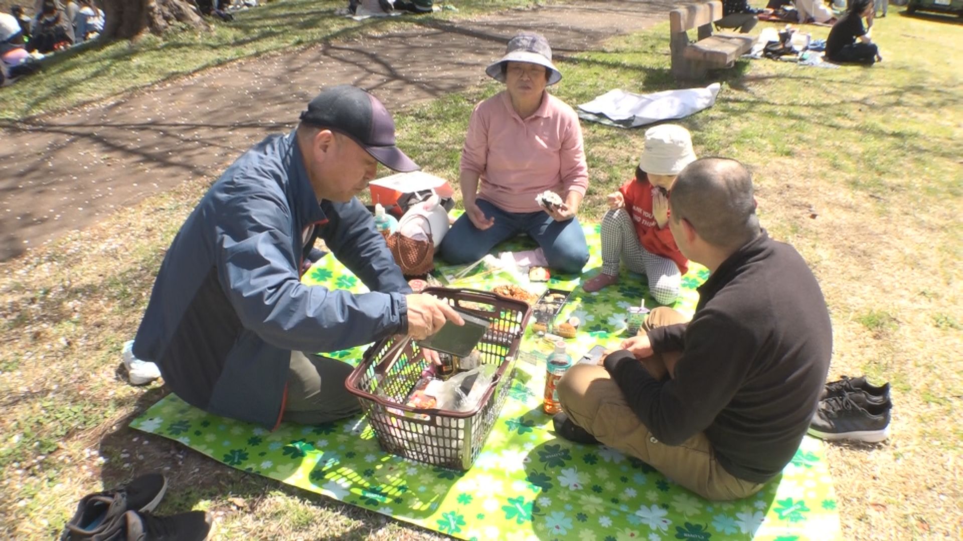 訪れた人は、サクラの木の下にレジャーシートを広げてお花見を楽しんでいました。