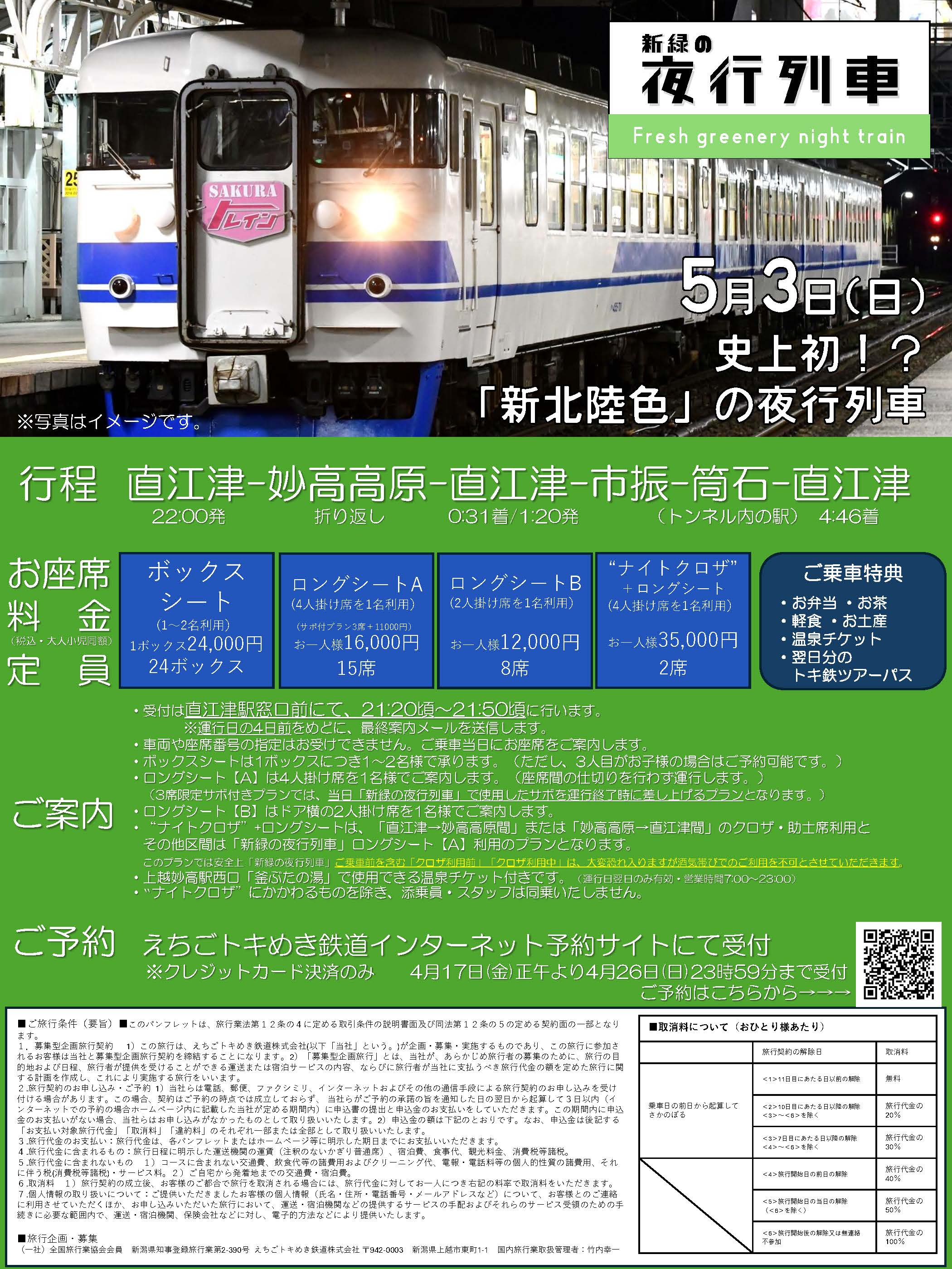 今年3月に「新北陸色」に塗装変更したえちごトキめき鉄道の「TOKIトレイン」による「新緑の夜行列車」が5月3日(日)に運行されます。ネット予約が4月17日(金)正午から始まっています。