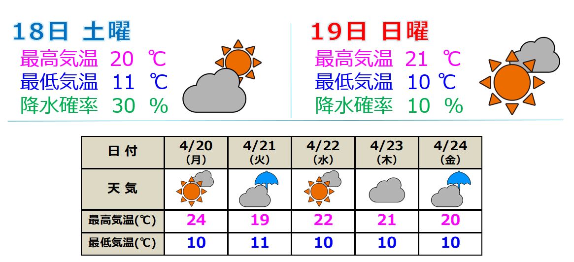 ・20(月)まではお出かけ日和が続きそうですが、火曜以降の天気は短い周期で変化