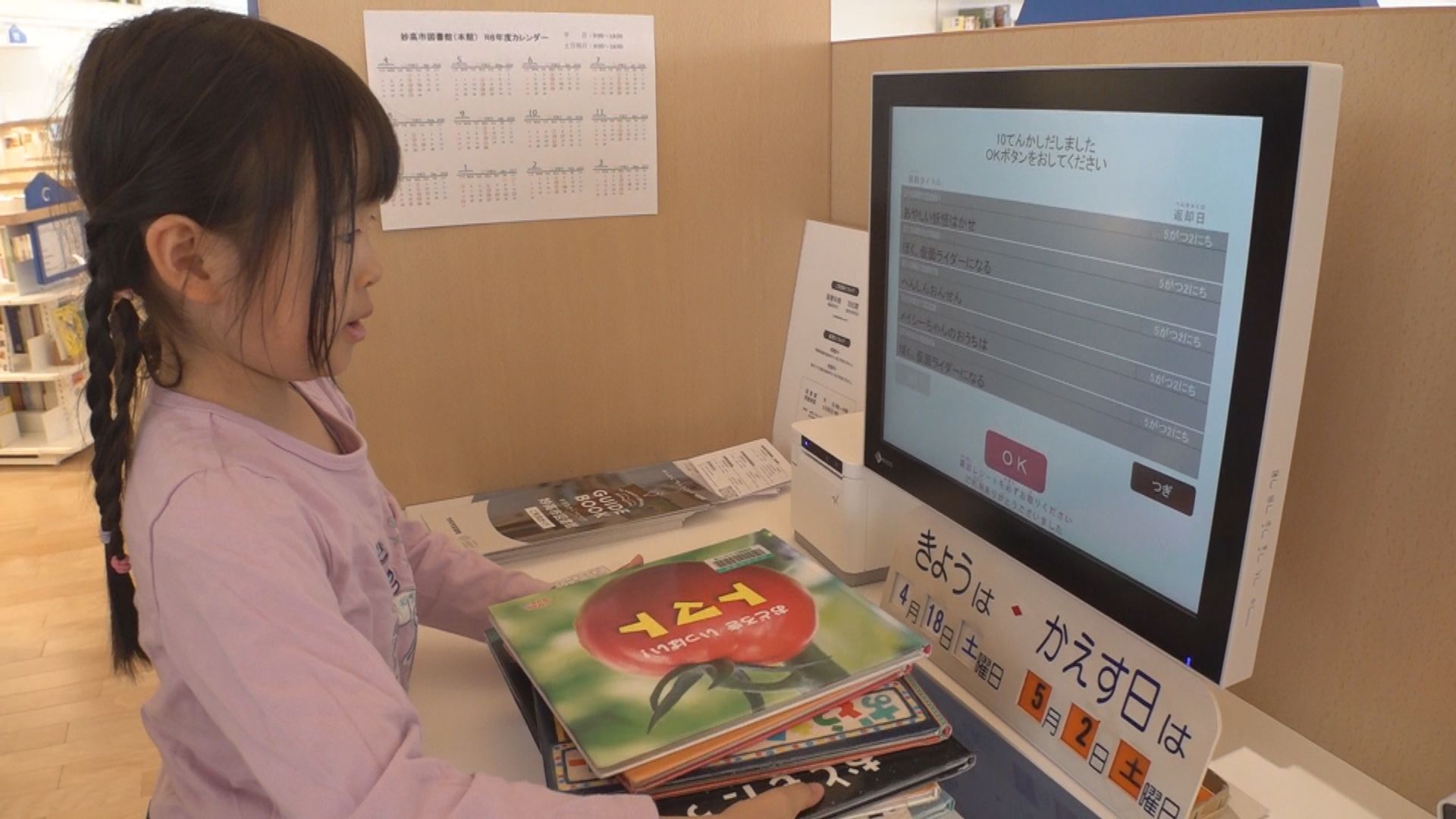 「うれしかった。本を選ぶのが楽しい。(好きな本は)『かいけつゾロリ』」