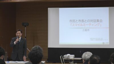 上越市の小菅市長が各地に出向いて市民と対話する集会「スマイルミーティング」が始まりました。20日(月)は第1回が大島区で開かれ、大雪のときの除雪の対応などについて意見が交わされました。