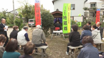 平成2年にお堂を改築し、4月24日に落成法要を行って以来、毎年この日に「地蔵まつり」が行われています。今年は地域住民など25人ほどが参列し、焼香をあげながら子ども達の成長や無病息災を願いました。