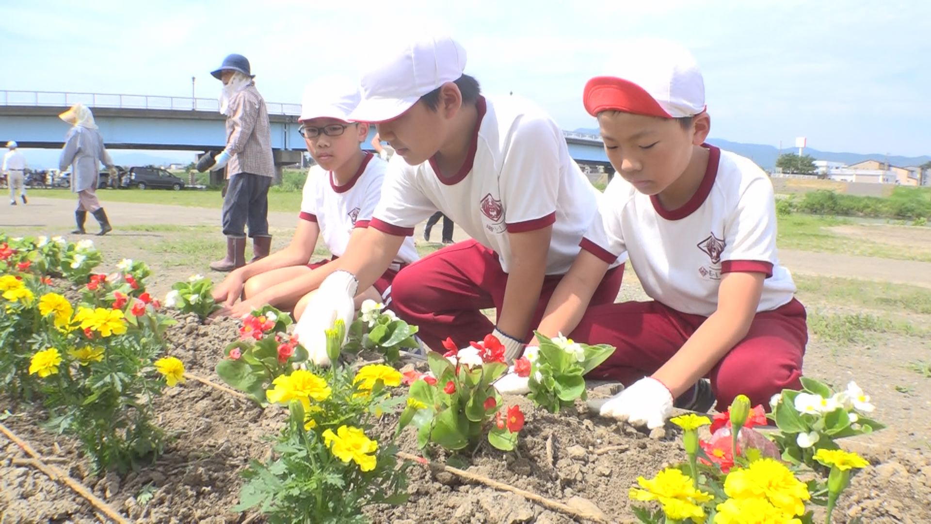 上越市稲田の関川河川敷で、5日、地域の住民と稲田小学校の児童が花の苗2600株を植えた。