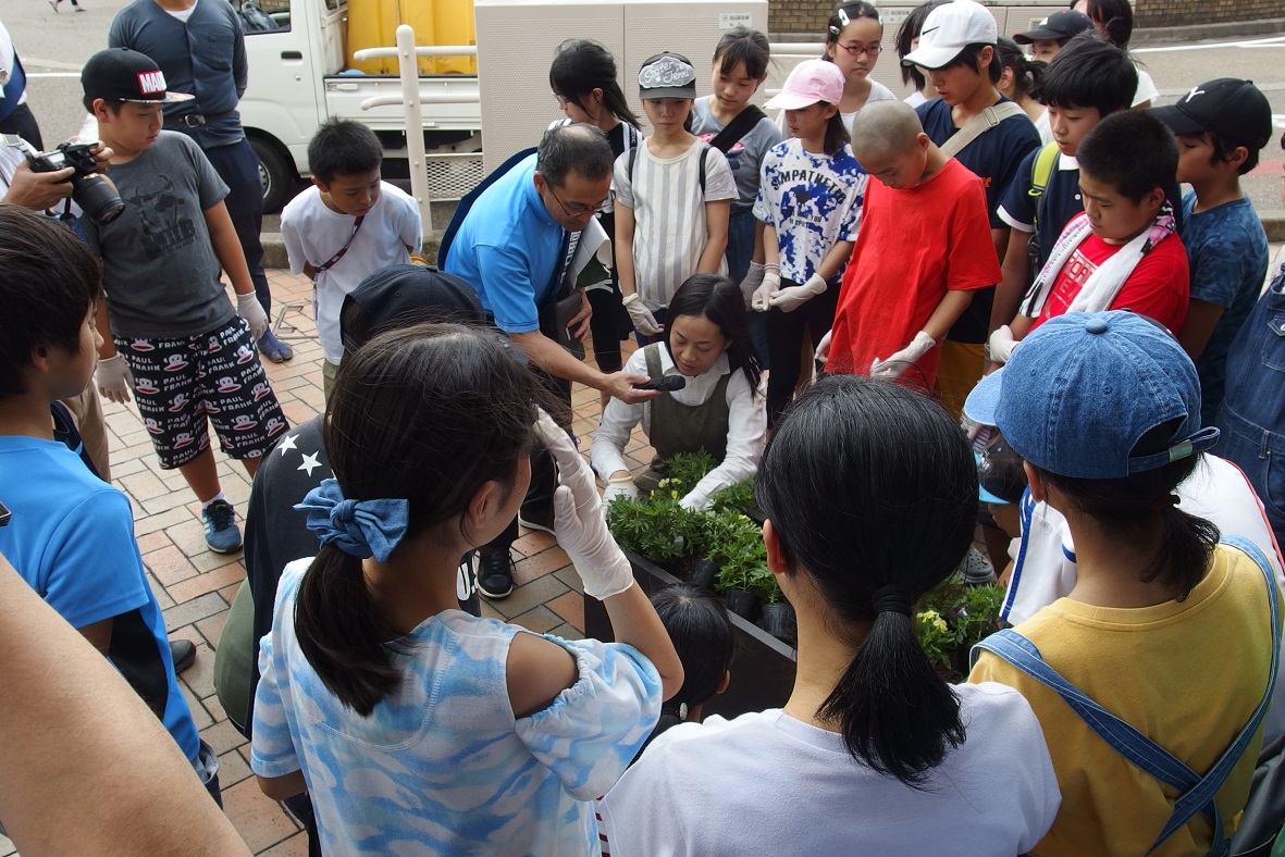 きょうは、ロータリークラブのメンバーや寄贈先の団体の他、地元町内会や大町小学校の6年生も参加し、総勢80人でプランターにマリーゴールドとビオラの苗を植えた。