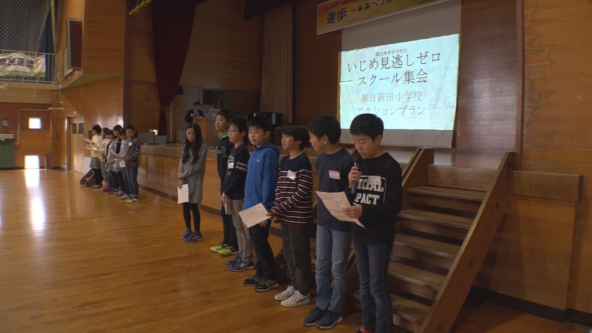 集会では、それぞれの学校のいじめ対策が発表された。そのうち、春日新田小学校では男女関係なく仲良く過ごせるように、毎週金曜日の朝に、学年ごとのレクリエーションを取り入れたことや、毎日の掃除の時間は、解散するときに声をかけながらハイタッチを交わしていることなどが紹介された。