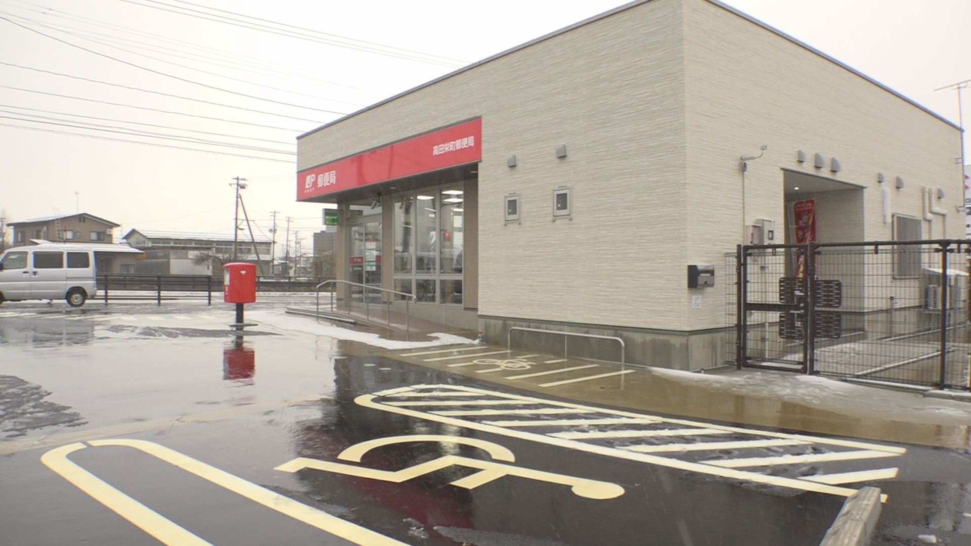新しい高田栄町郵便局は高田本町郵便局から約700m離れた栄町西の交差点、くびき野バス本社営業所の隣にできた。敷地面積は約800㎡。駐車場はこれまでの2台から11台に増えました。また、車いす専用の駐車スペースや入り口までのスロープが設けられ、バリアフリーに対応している。