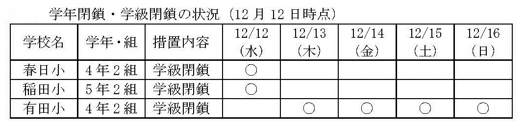 ■有田小学校(在籍526人)4年2組 24人中6人が欠席⇒ 13日(木)~16日(日)まで学級閉鎖