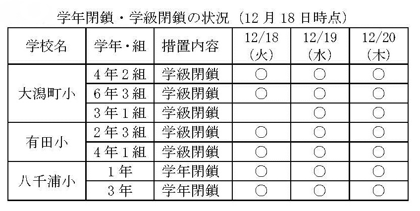 ■大潟町小学校(在籍434人)3年1組 38人中9人が欠席⇒ 19日(水)~20日(木)まで学級閉鎖