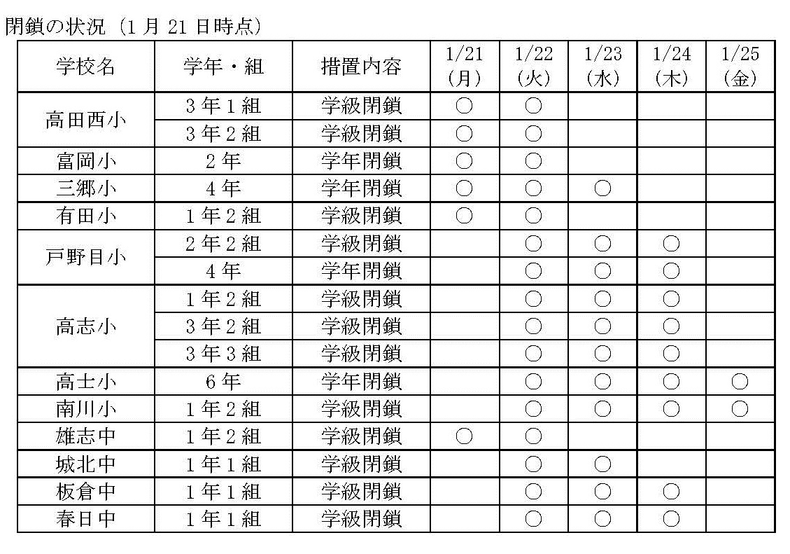 インフルエンザによる欠席者が相次ぎ、下記の小・中学校で学級・学年閉鎖の措置をとる。