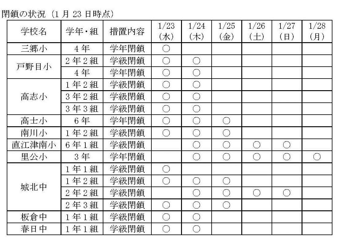 インフルエンザによる欠席者が相次ぎ、下記の小・中学校で学級・学年閉鎖の措置をとる。