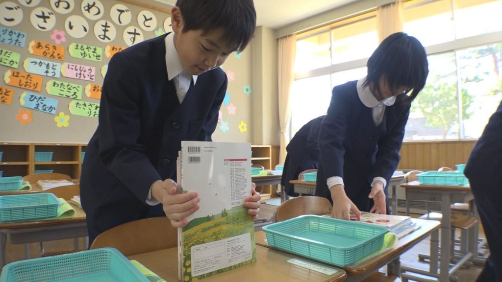 一番忙しいのは新一年生のクラス。教室の掃除にはじまり、机や椅子に名前のシール貼り。そして歓迎のメッセージと飾りつけ。仕上げは新しい教科書と配り物をそれぞれの机に置いていく。