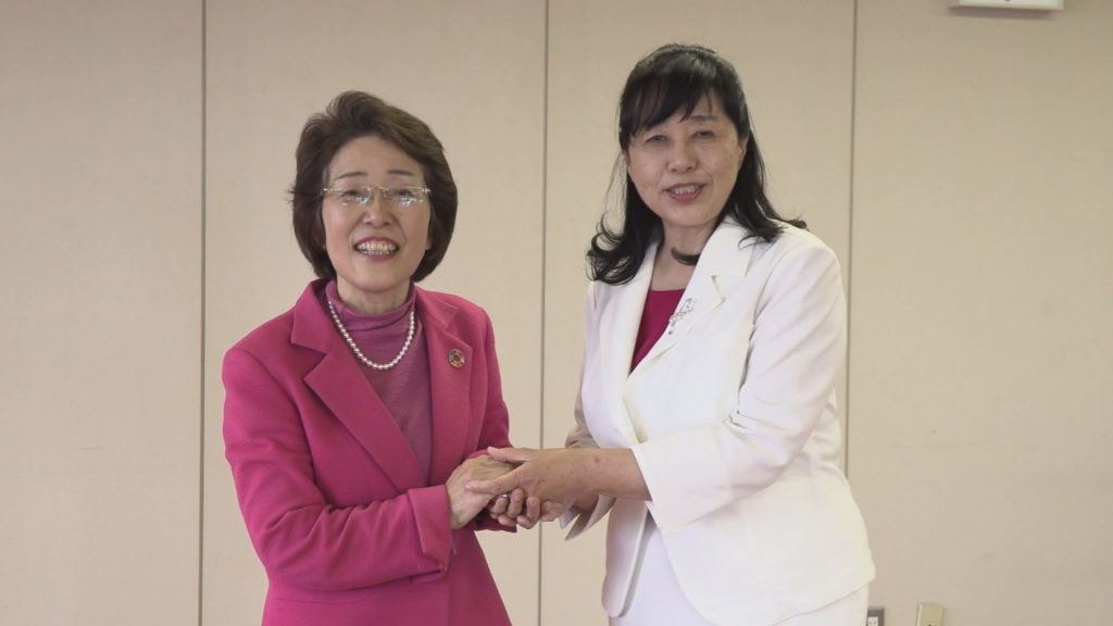 2期目の当選を決めた秋山さんは「新潟県議会が古い。改革度が低い。今回強力な女性パワー(櫻庭さん)も入った。女性議員が倍になったのでそこを変えたい。」と語り、女性議員の増加で議会が変わることに期待をこめた。そして2人で握手を交わし協力を約束した。