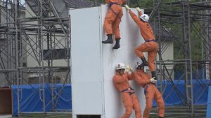 はしご登はんは、建物への進入を想定したもので命綱を結んでからはしごを登りきるまでの時間を競う。県大会に出場できるのは、男女1人ずつ。