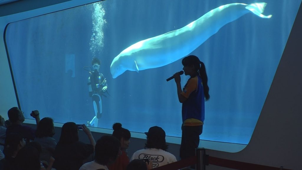 1周年を記念して26日からはじまった「シロイルカファンタイム」では、飼育員がシロイルカとふれあいながら生態を説明した。