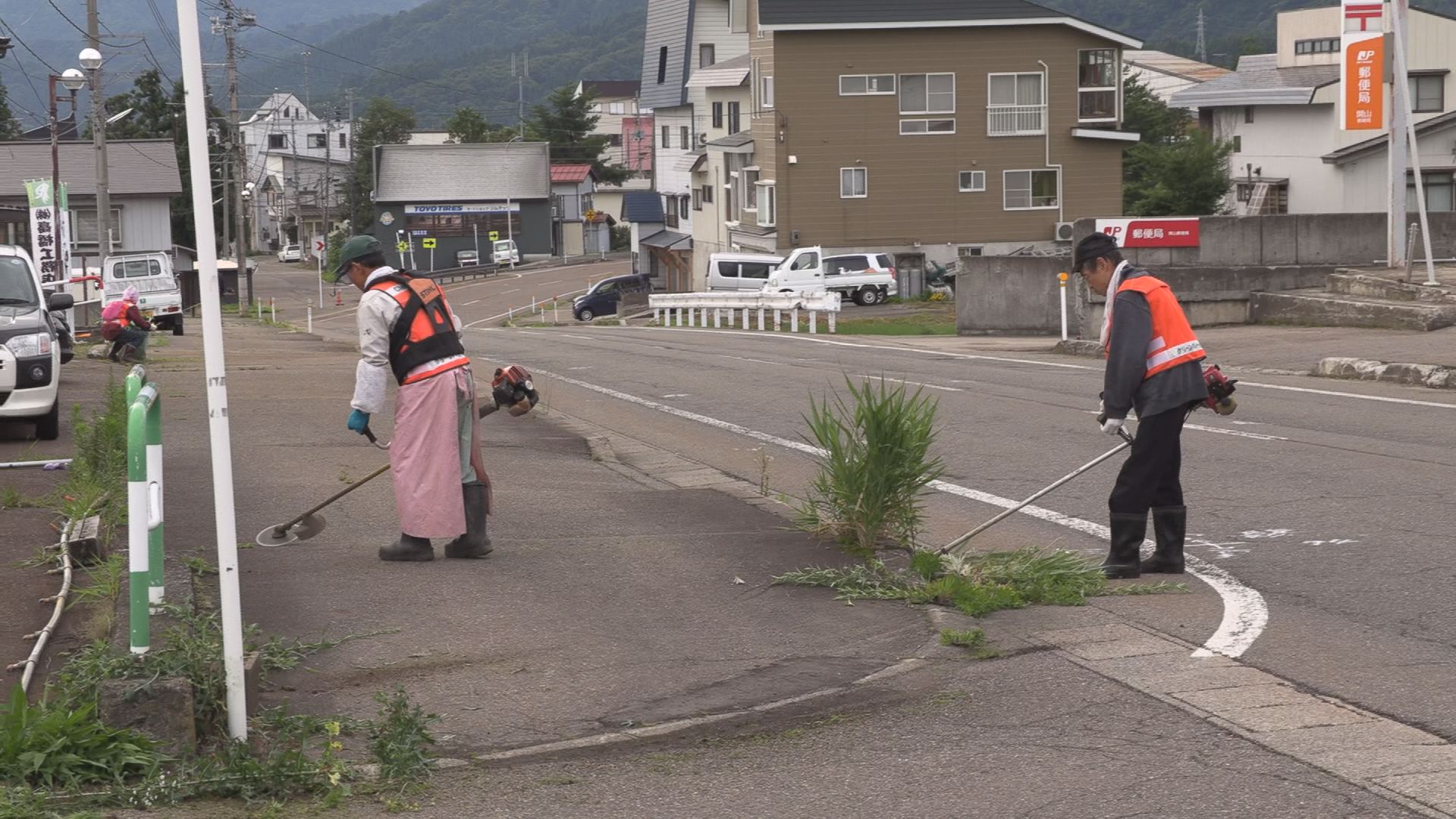 草刈りが行われたのは関山神社からえちごときめき鉄道関山駅までの道沿い約1.2㎞。まちの美化に取り組むエコクラブ妙高の呼びかけで、地元の住民と市の職員15人がボランティアで参加した。