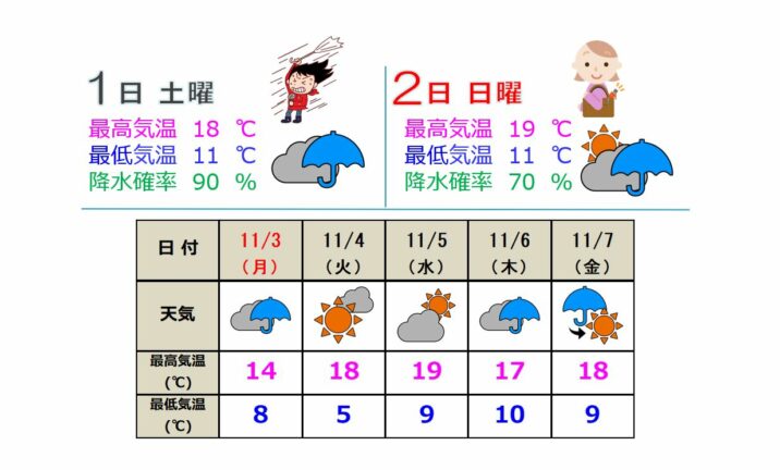 あす11月1日からの3連休は雨雲優勢の天気になりそうです。特に今夜からあすにかけては暴風への警戒が必要になりそうです。 今後の雨雲の動きを少し詳しく見ていきましょう。あす1日(土)…