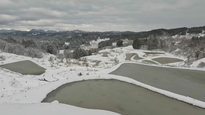 撮影:2025年12月12日 牧区にある大月の棚田。 道路わきから見渡すことができます。 四季折々に様々な表情を見せアマチュアカメラマンにも人気です。 雪がうっすら積もると畦の…