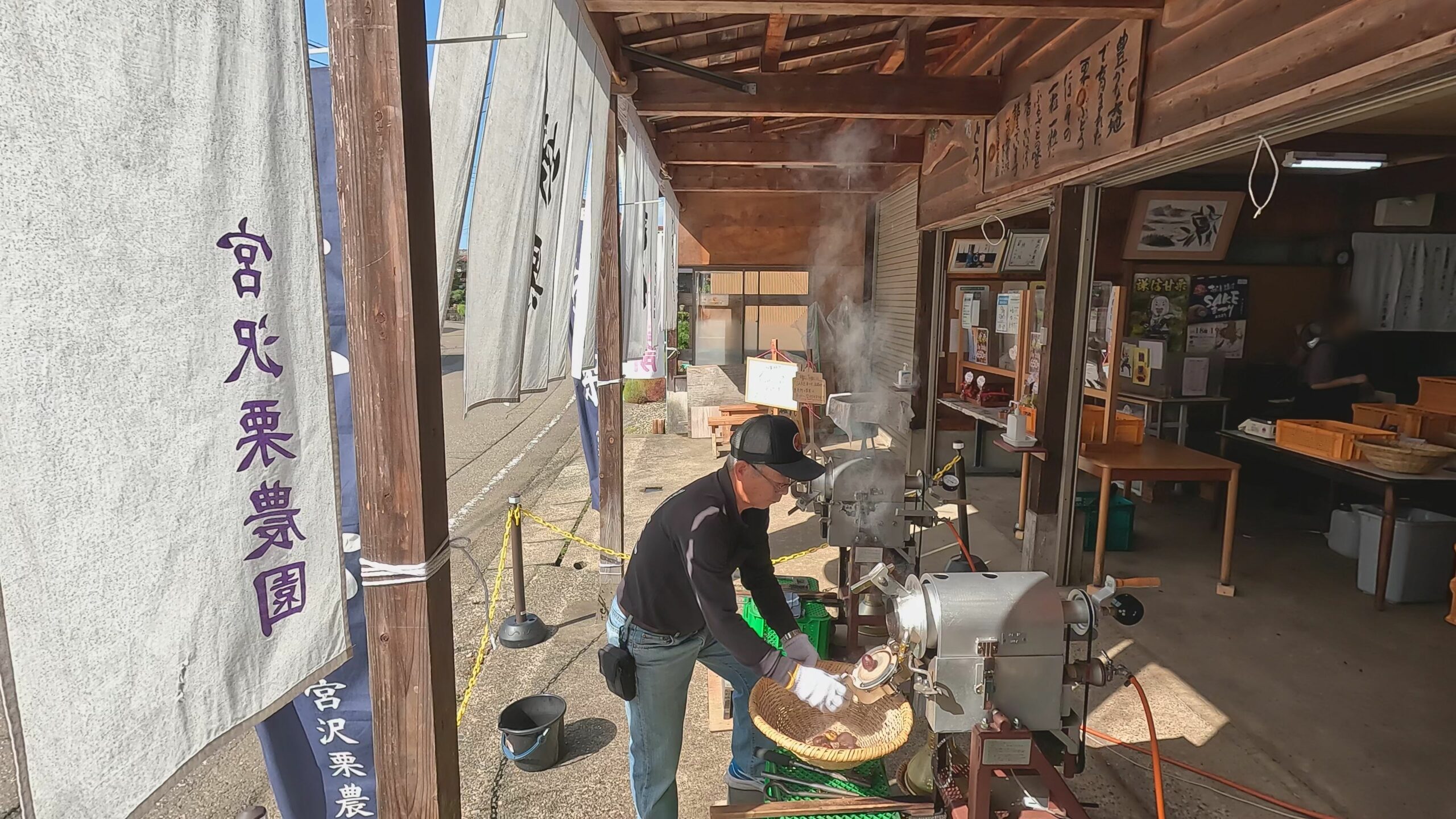 三和区北代の栗農園の直売所では、秋になると焼栗の販売が始まります。