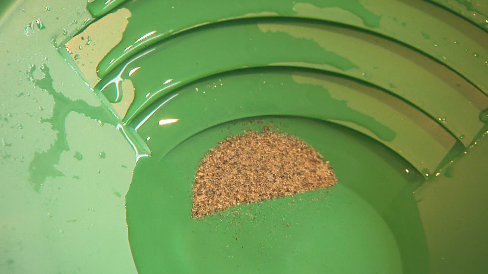 ⑤砂が少なくなってきたら道具の段差に残った砂を集めて、中の水をくるっと回すと砂と金が分離します。