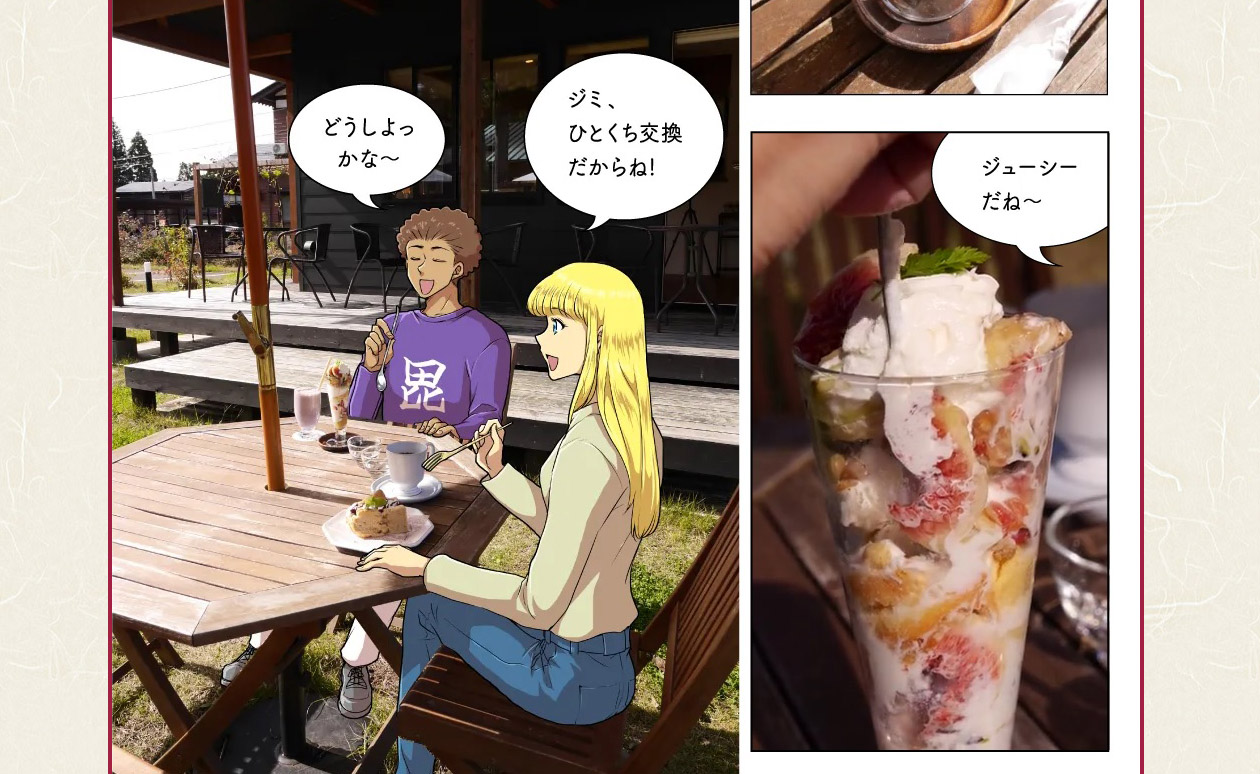 エラとジミの2人は宮澤栗農園、三和牛乳、マンマルテラス、CAFE HAYASHIを訪れて、三和区の自然や恵み、グルメを堪能しています。