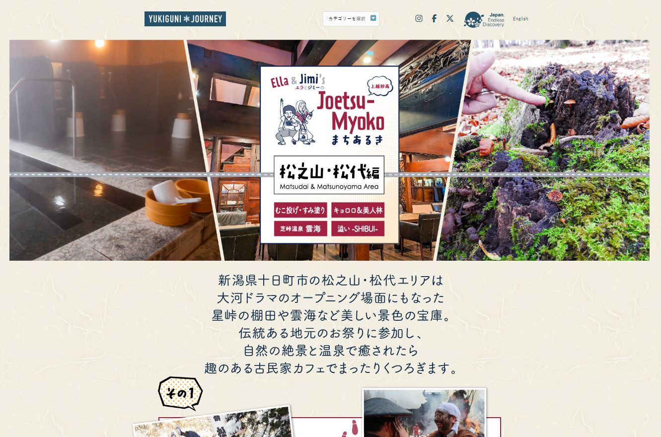 雪国 上越地域の暮らしや食文化、見どころなどを全国、世界に発信している観光情報サイト「雪国ジャーニー」。その中の人気コーナー「エラとジミのJoetsu-Myokoまちあるき」で新エピソードとして、十日町市の中でも上越市にほど近いスポット「松之山・松代編」を公開しています。