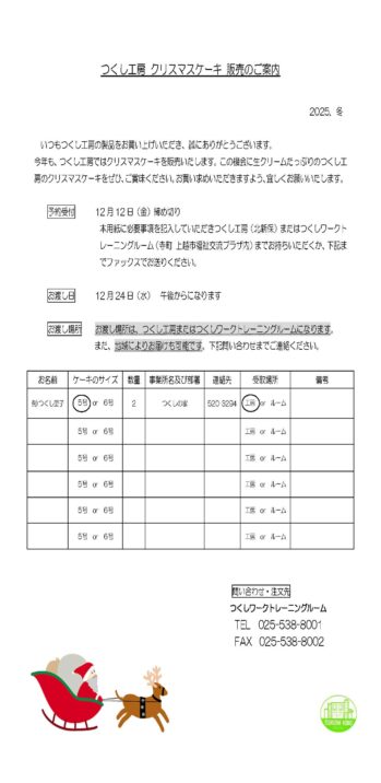 【お渡し場所】つくし工房(北新保)、つくしルーム(寺町)のどちらか