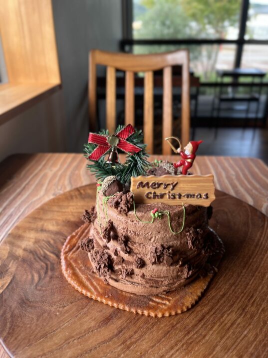 切り株型のチョコ尽くしのクリスマスケーキです。溶けが良い蒸し焼きチョコケーキに⁡コクのあるチョコクリーム、サクサク香ばしいチョコクランチを重ね、チョコスポンジで挟んで軽い口当たりのチョコクリームで覆っています。