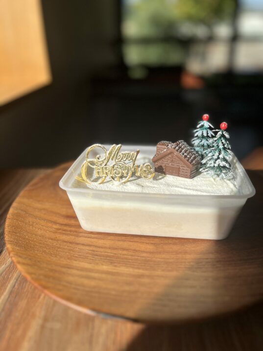 上越市の明日ヶ原テラ栗農園で収穫されたクリを使用。香ばしく焼き上げた焼きグリをたっぷり使ったマロンアイスに、米粉とアーモンドのシュトロイゼル フランボワーズのソースミルクのアイスを重ねたアイスクリームの「モンブラン」です。デコレーションのテーマは「モンブランの裾野 山小屋でクリスマスの朝」。付属のオーナメントを思い思いに飾り付けてお楽しみください。