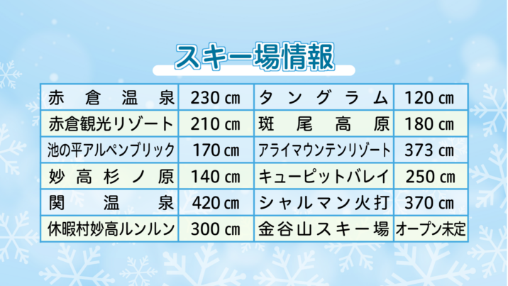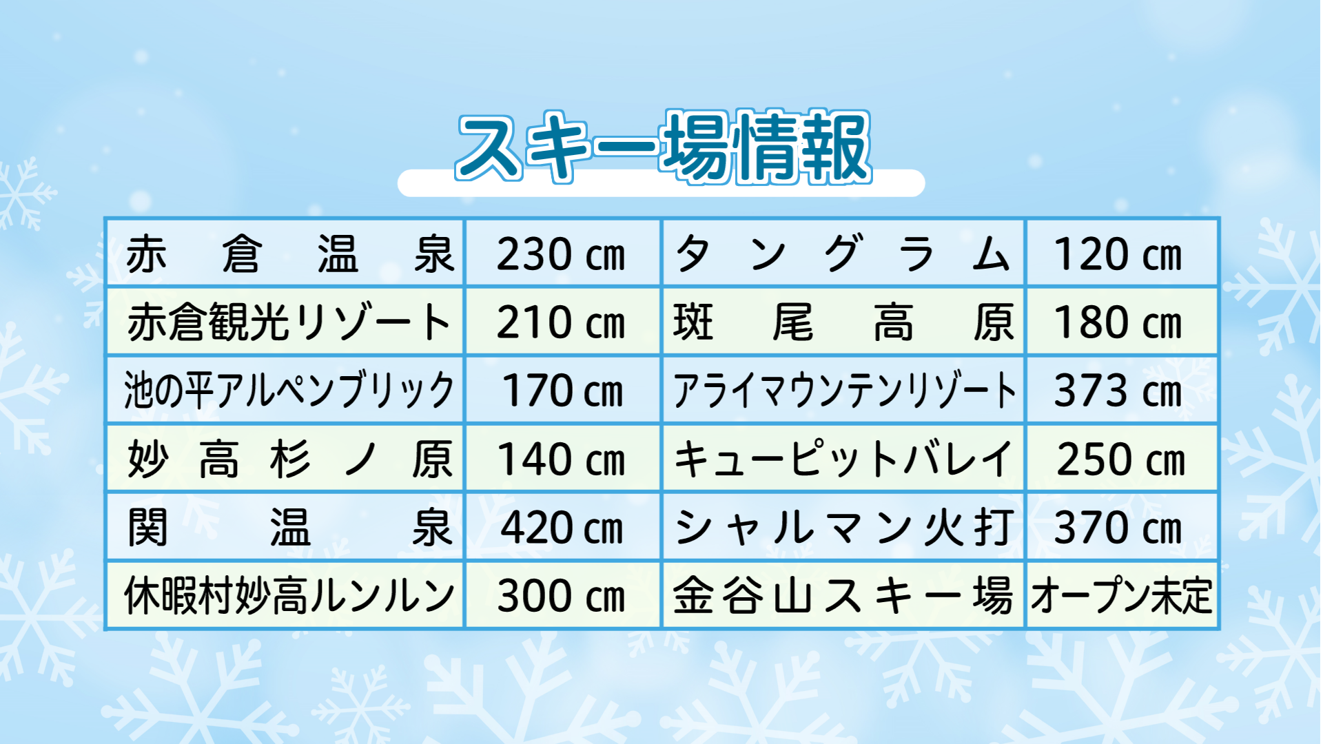 上越妙高エリアの各スキー場の積雪は下記の通り(1月22日 午前 現在)