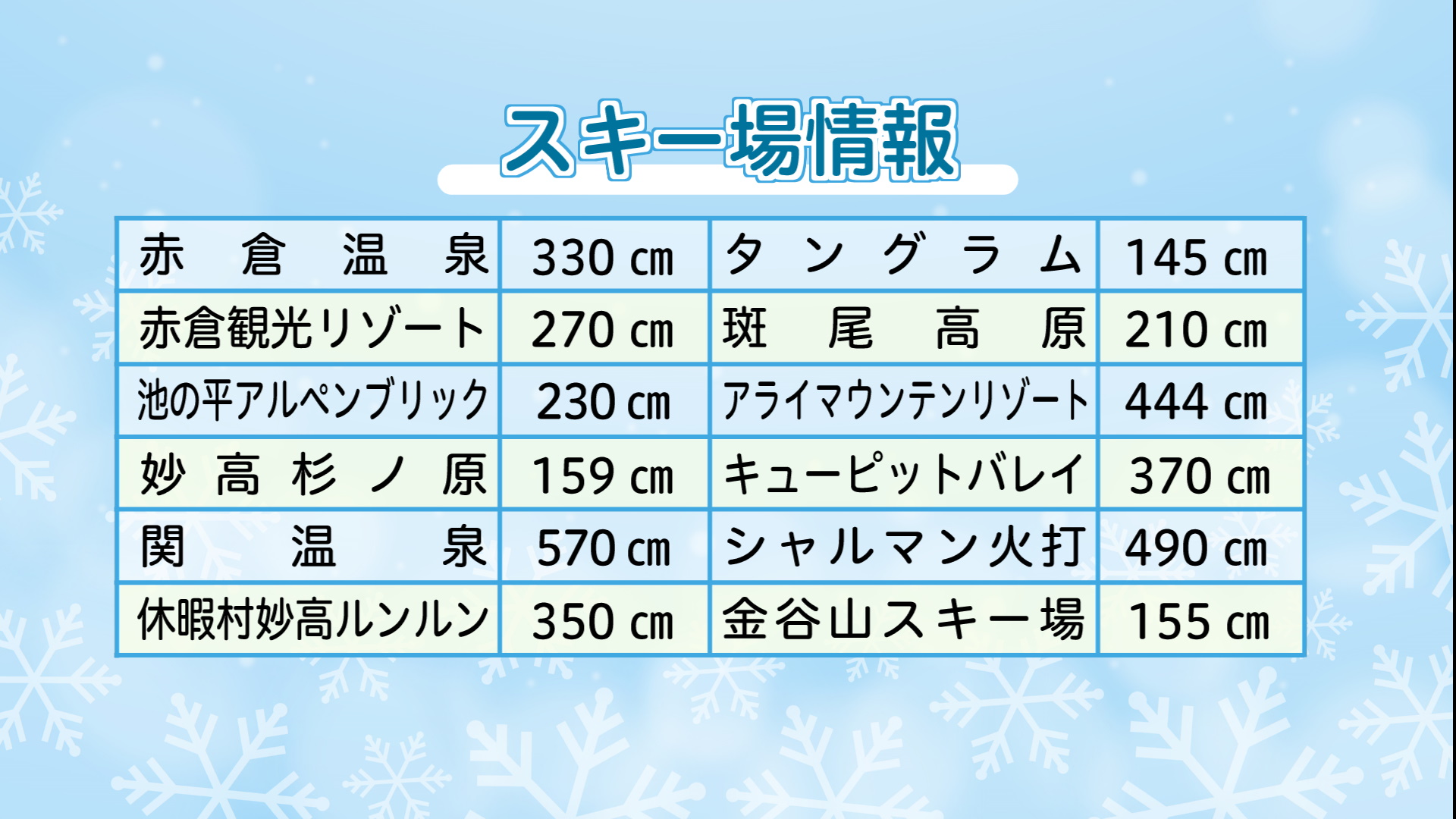 上越妙高エリアの各スキー場の積雪は下記の通り(2月6日 午前 現在)