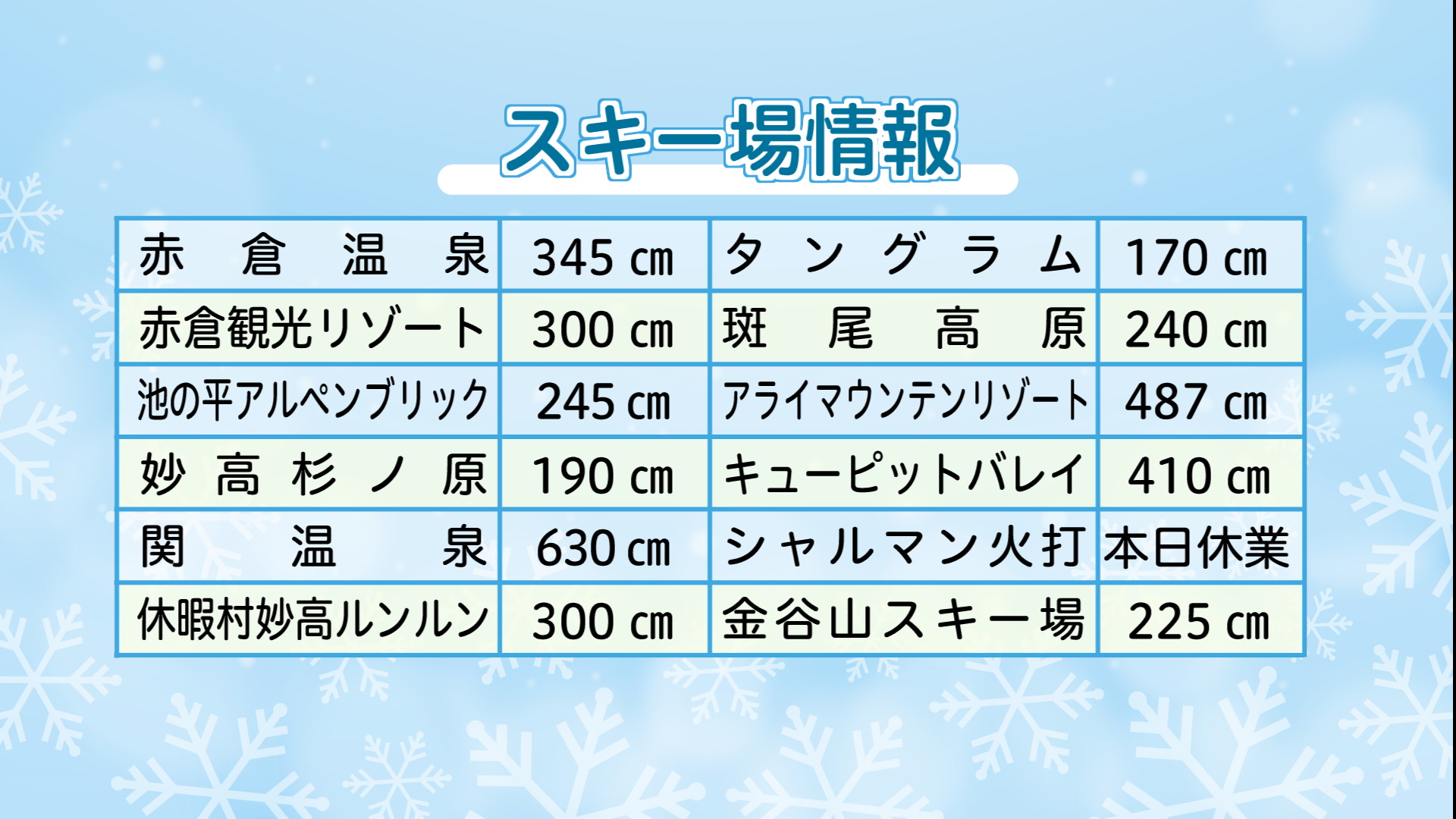 上越妙高エリアの各スキー場の積雪は下記の通り(2月9日 午前 現在)