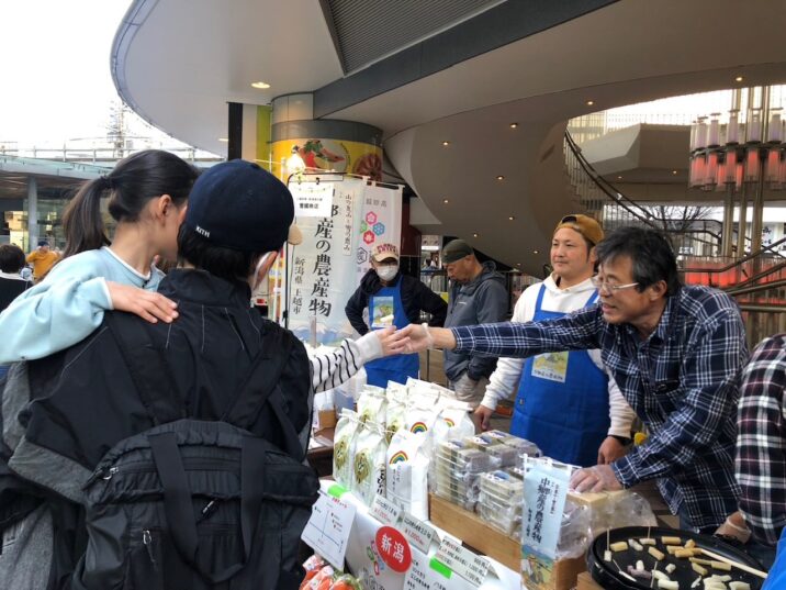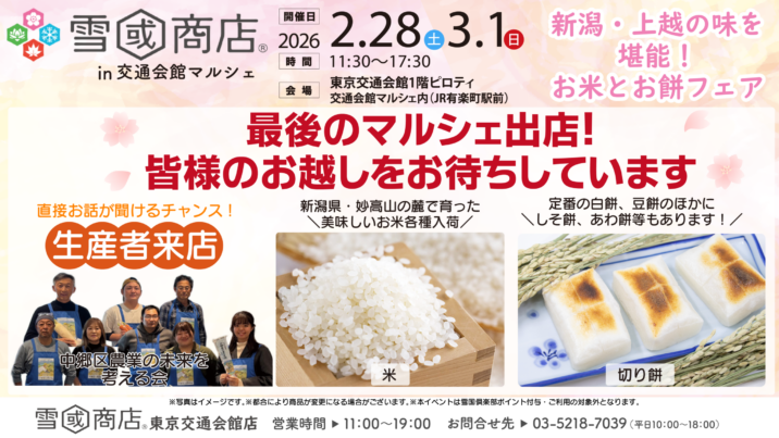 新潟県上越地域の特産品を販売している東京交通会館1階の「雪國商店」が、2月28日(土)と3月1日(日)の2日間、JR有楽町駅前で開催される「東京交通会館マルシェ」に出店します。今回は「中郷区農業の未来を考える会」のみなさんが、米や切り餅を販売します。