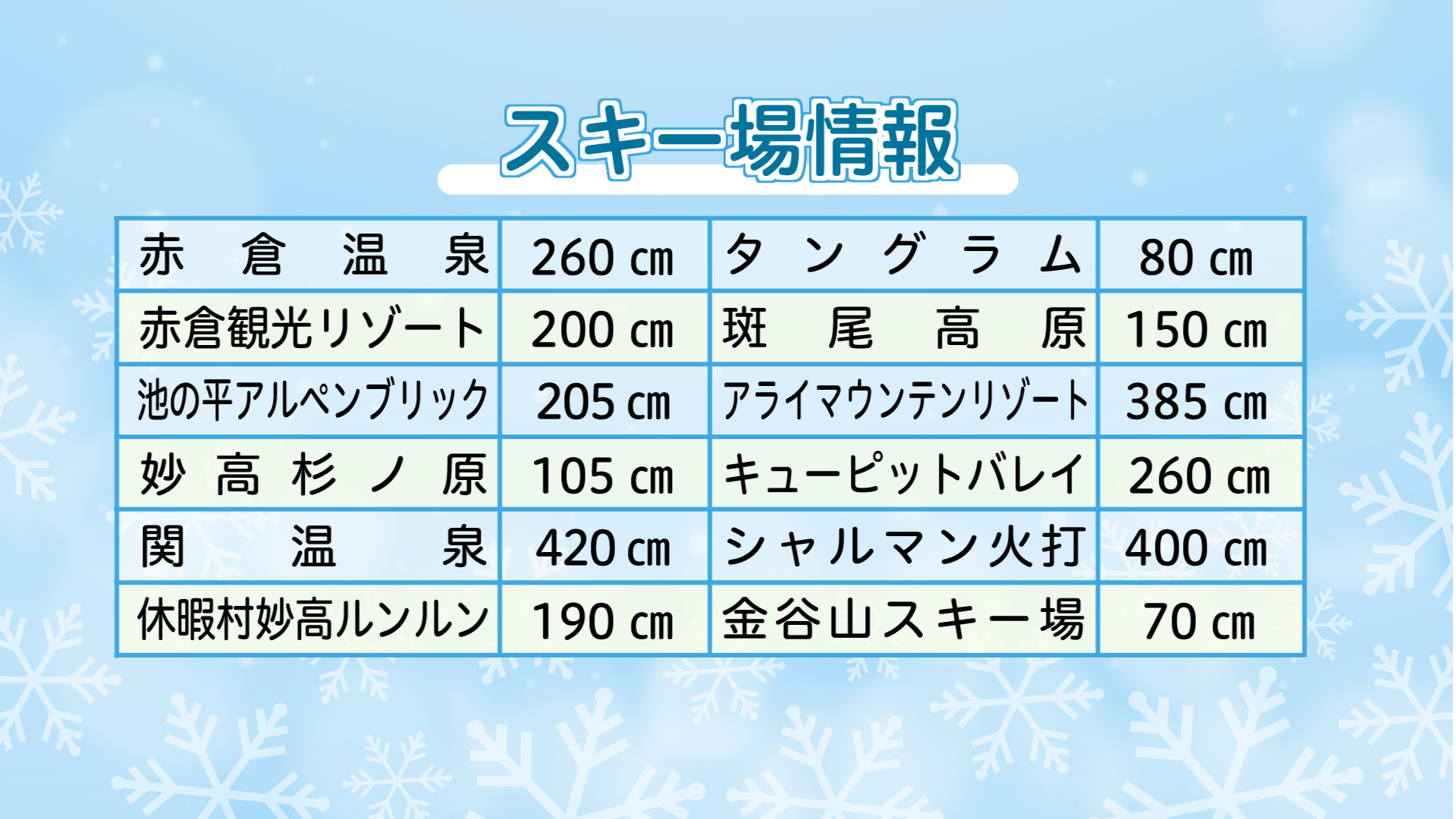 上越妙高エリアの各スキー場の積雪は下記の通り(3月6日 午前 現在)