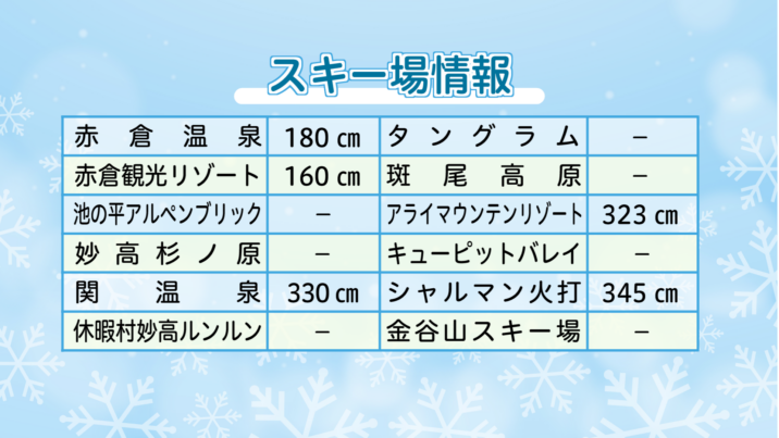 上越妙高エリアの各スキー場の積雪は下記の通り(3月30日 午前 現在)