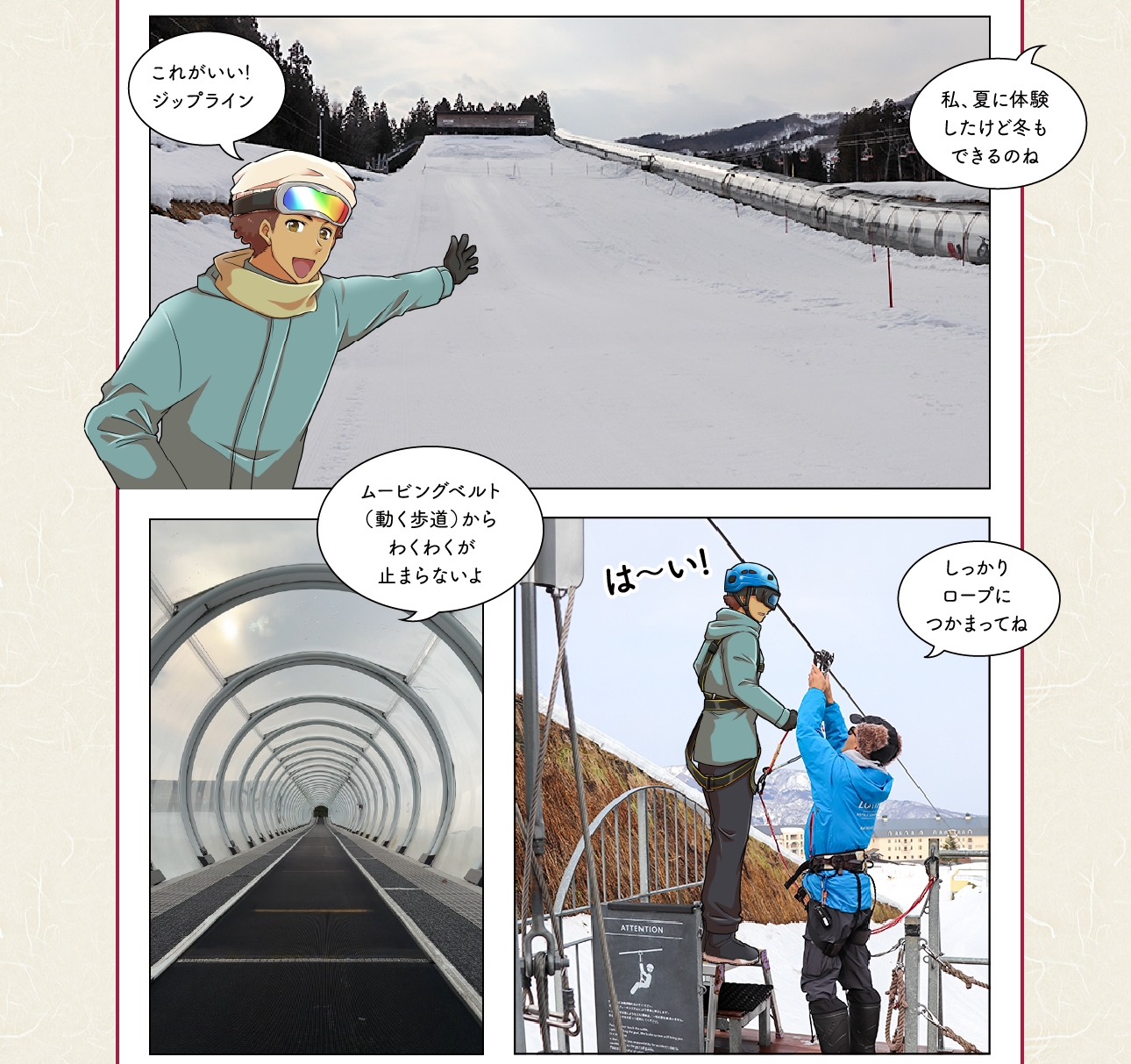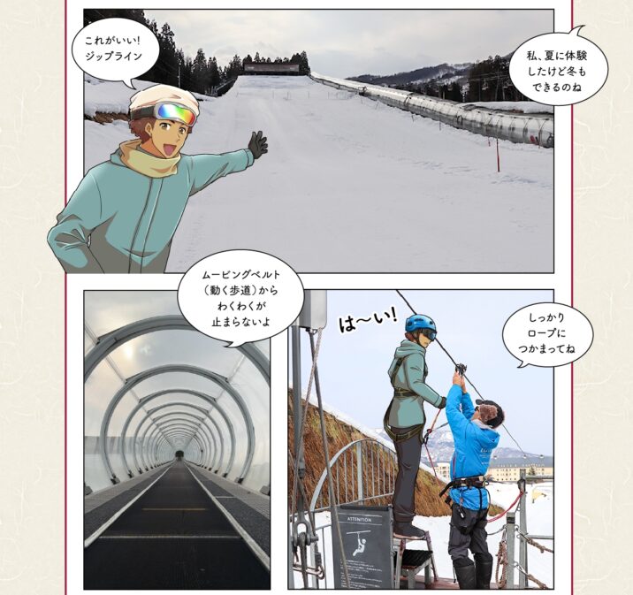 こちらのゲレンデではジップラインやスノーラフティングなど、多彩な雪上アクティビティが充実。スキーやスノーボードが滑れなくても楽しい時間が過ごせます。