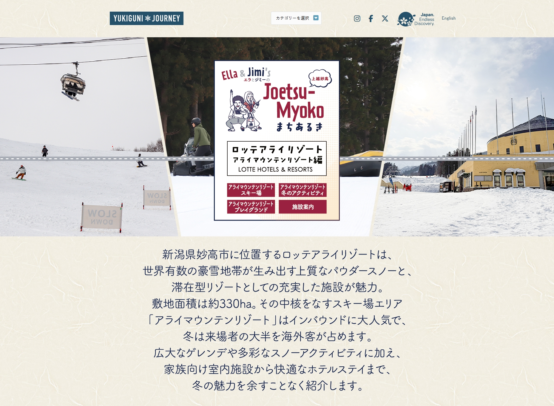 今回、新たに公開されたのは、世界有数の豪雪地帯が生み出す上質なパウダースノーと、滞在型リゾートが人気のロッテアライリゾートの中のスキー場エリア「アライマウンテンリゾート編」です。スキー場はもちろん、そこで楽しめる冬のアクティビティや室内の遊び場プレイグラウンド、ロッテアライリゾートのホテル棟やプール、温泉などを紹介しています。