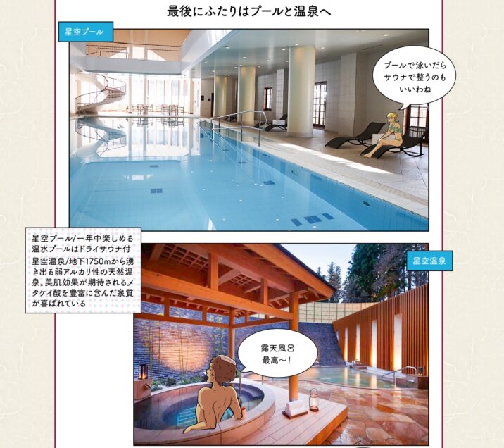 ロッテアライリゾートはスキー場以外にも、4つのホテル棟、スパやプールなど、そのほかの施設も充実しています。エラとジミは各レストランや客室などを訪ね、癒しと贅沢な時間を堪能しています。