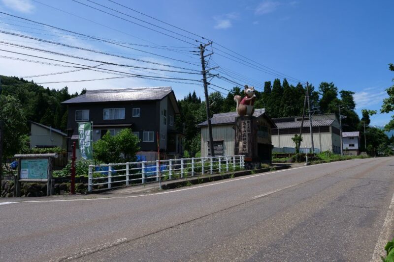 キャンプ場への目印は、県道新井中郷線沿いにある大きなリスの看板。ここからキャンプ場に向かう山道に入り、車で10分ほど上ると到着です。妙高市と飯山市を結ぶ国道292号からキャンプ場に入る道もありますが、狭いので県道新井中郷線からがおすすめです。