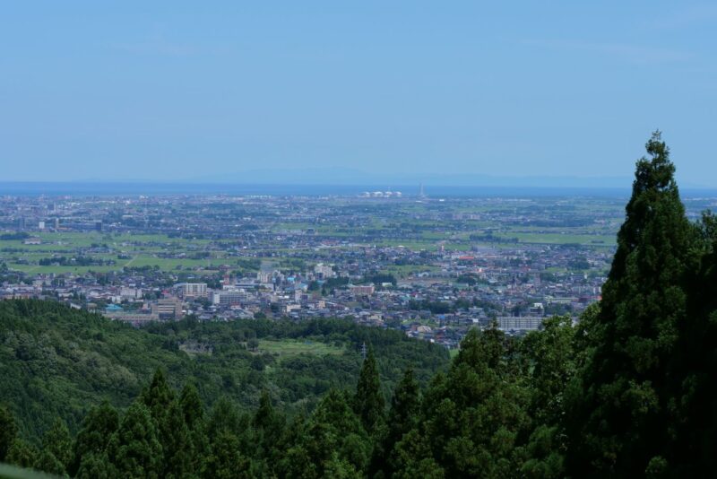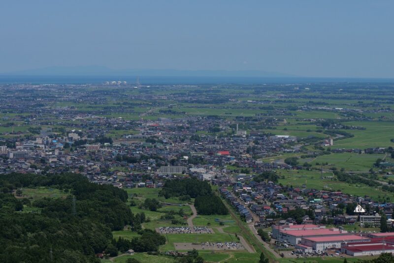 キャンプ場へ向かう途中、標高が高くなると、頸城平野を一望することができるスポットもあります。