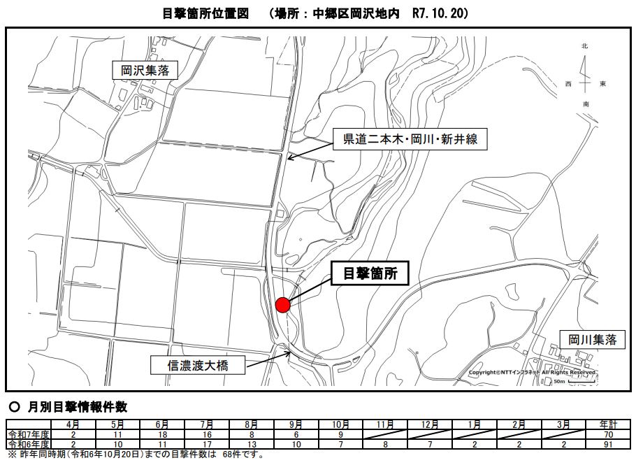 上越市からクマの目撃情報についてお知らせします。 10月20日(月)午前10時20分頃、中郷区岡沢地内 信濃渡大橋付近の畑で子グマ1頭を目撃したとの通報が、午前10時40分頃、中郷区総合事務所にありました。付近の方は、十分注意してください。 クマやイノシシを見かけた際は、環境政策課(電話025-526-5111)または総合事務所、警察署(電話110番)に連絡してください。