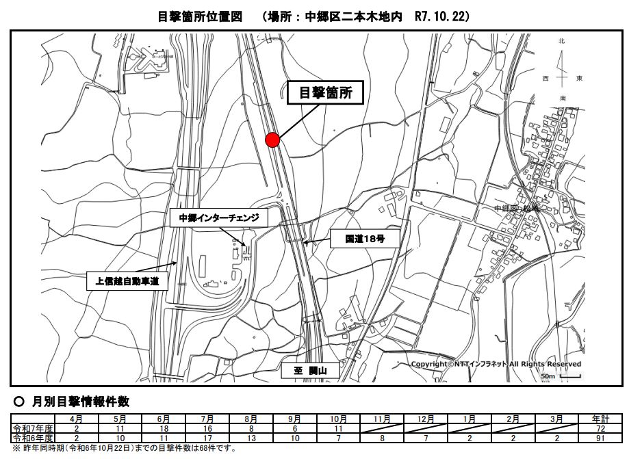 上越市からクマの目撃情報についてお知らせします。 10月22日(水)午後0時13分頃、二本木地内 中郷インターチェンジから北へ200m付近で、国道18号を西から東へ横断する子グマ1頭を目撃したとの通報が、午後0時20分頃、中郷区総合事務所にありました。付近の方は、十分注意してください。 クマやイノシシを見かけた際は、環境政策課(電話025-526-5111)または総合事務所、警察署(電話110番)に連絡してください。