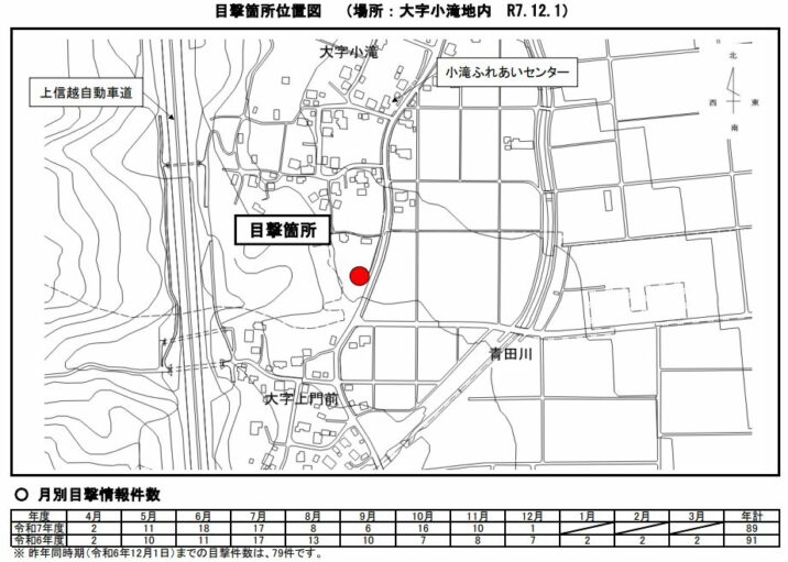 12月1日(月)午後6時15分頃、大字小滝地内、小滝ふれあいセンターから南に250mほどの県道で体長100センチメートルほどのクマ1頭を目撃したとの通報が、午後7時頃、上越市役所にありました。付近の方は、十分注意してください。 クマやイノシシを見かけた際は、環境政策課(電話025-526-5111)または総合事務所、警察署(電話110番)に連絡してください。